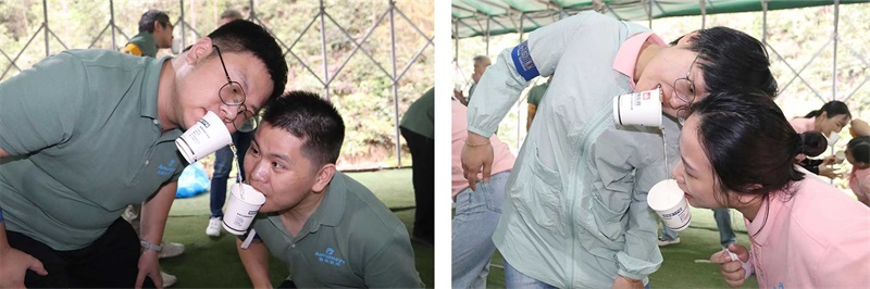紙杯傳水、快樂加碼,在傳遞的過程中,有些伙伴心細(xì)配合很好,非常完美地將自己杯中的水全部傳遞給同伴,但也有伙伴沒有掌握規(guī)律,在傳遞的過程中被潑了一臉的水。